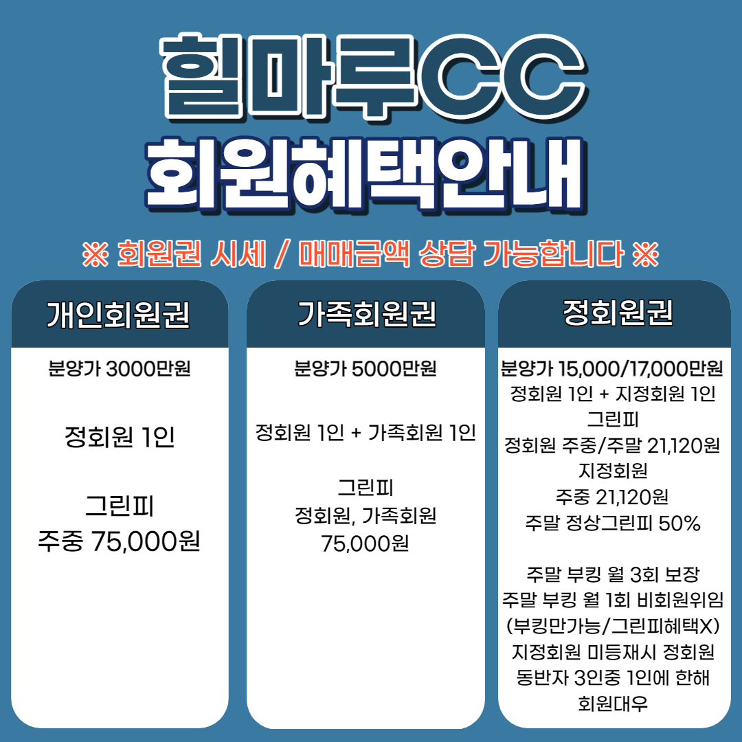 힐마루CC 회원권은 주중개인회원권, 주중가족회원권, 정회원권으로 구분되어있습니다.