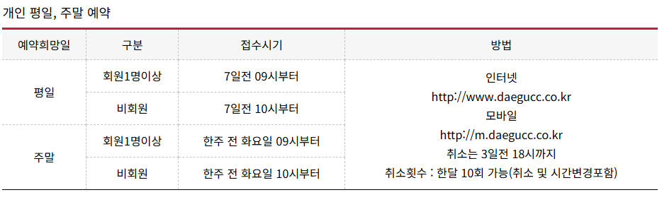 - 예약팀수 변경(증감) 시 8일 전까지 예약실로 문의 바랍니다