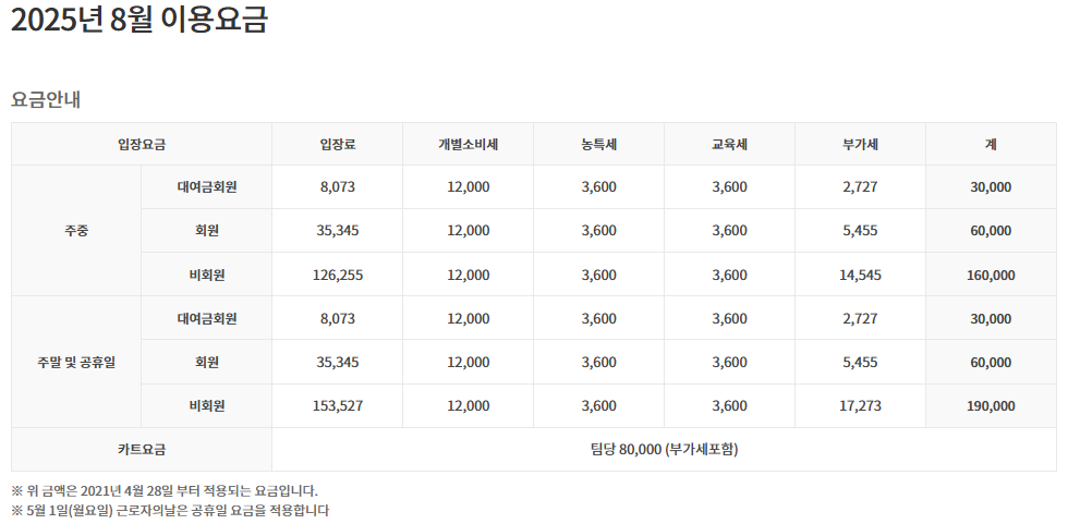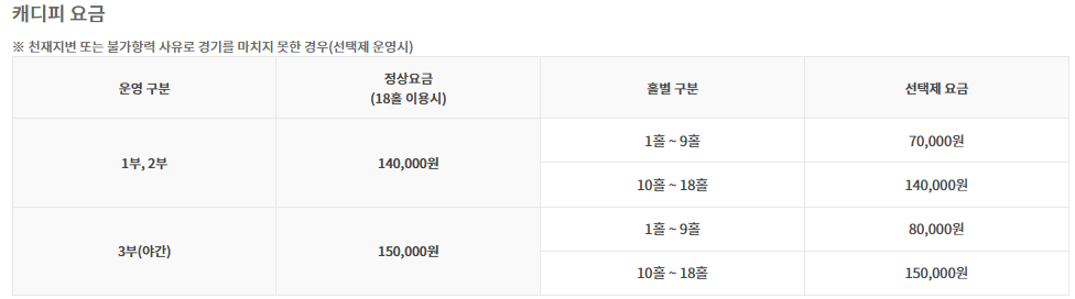 | 비고 | 예약자는 반드시 입장, 동반회원 3명 중 1명 명단변경 가능 (비회원 불가) 우선예약으로는 예약자 및 동반자 월 2회만 입장가능 1일 우선예약 접수 팀 수는 1일 선착순으로 10팀 예약시간 배정 예약 취소일 : 전주 일요일 17:00 까지 |