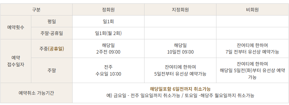 예약빈도가 적은 회원님 순으로 취소분에 대하여 배정됩니다