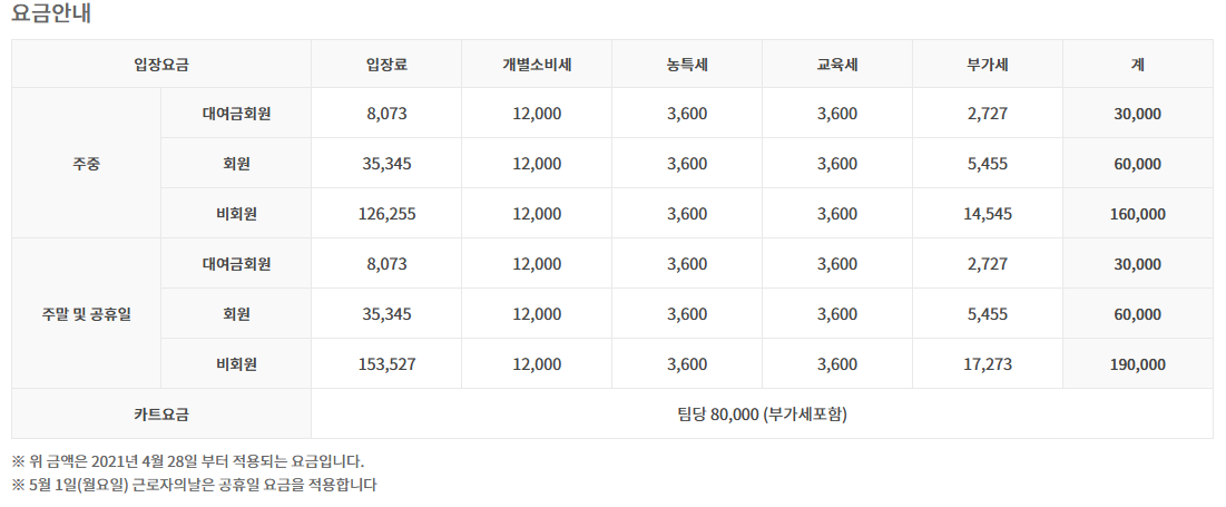 | 비고 | 예약자는 반드시 입장, 동반회원 3명 중 1명 명단변경 가능 (비회원 불가) 우선예약으로는 예약자 및 동반자 월 2회만 입장가능 1일 우선예약 접수 팀 수는 1일 선착순으로 10팀 예약시간 배정 예약 취소일 : 전주 일요일 17:00 까지 |