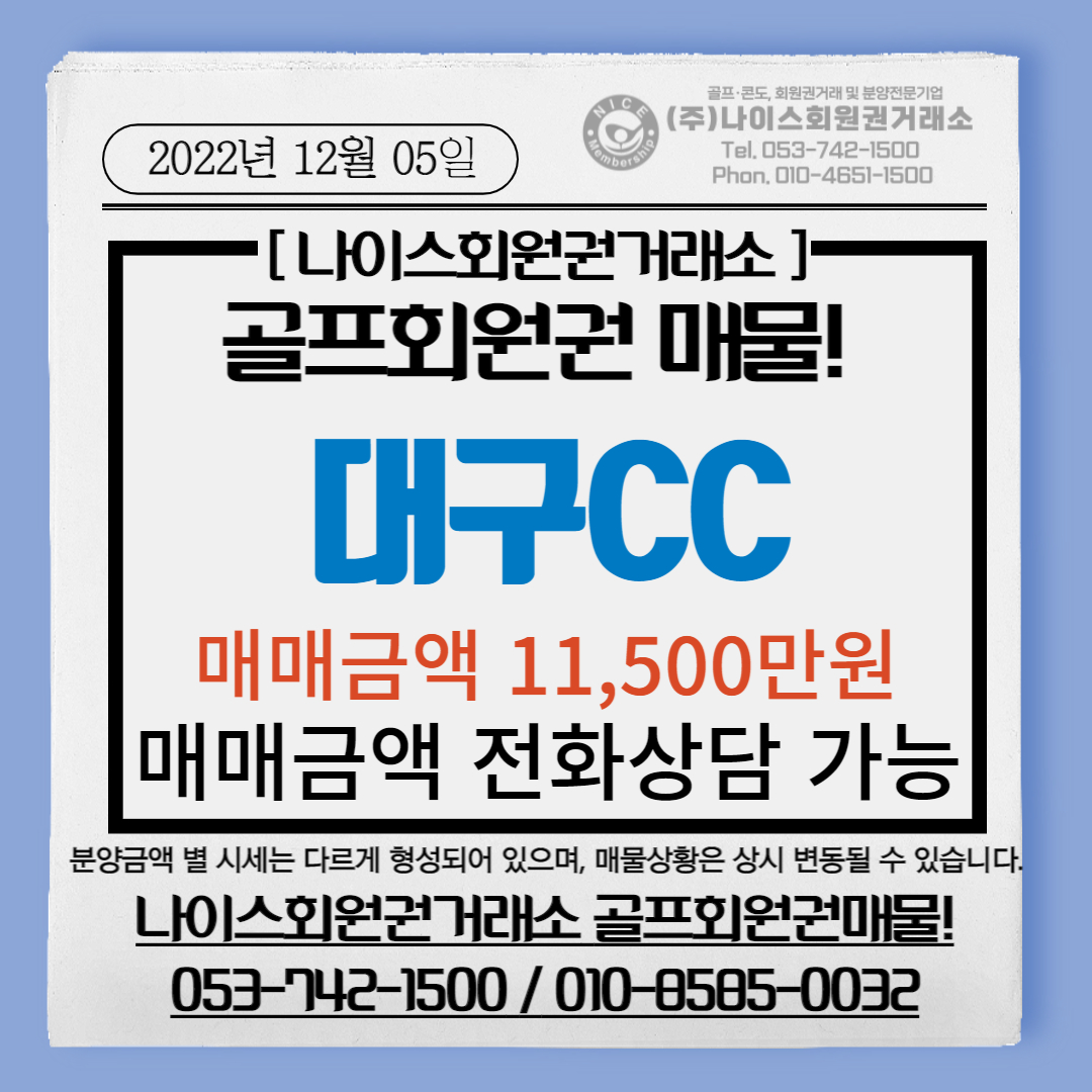 대구CC 회원권에 관심있으신 분은 나이스회원권거래소로 문의주시면