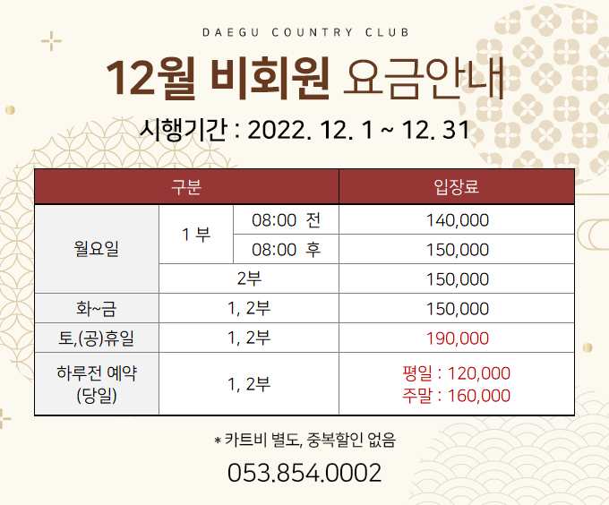 12월 대구CC의 비회원그린피를 안내드리겠습니다.