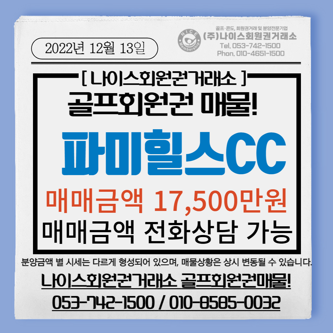 파미힐스CC 회원권에 관심있으신 분은 나이스회원권거래소로 문의주시면